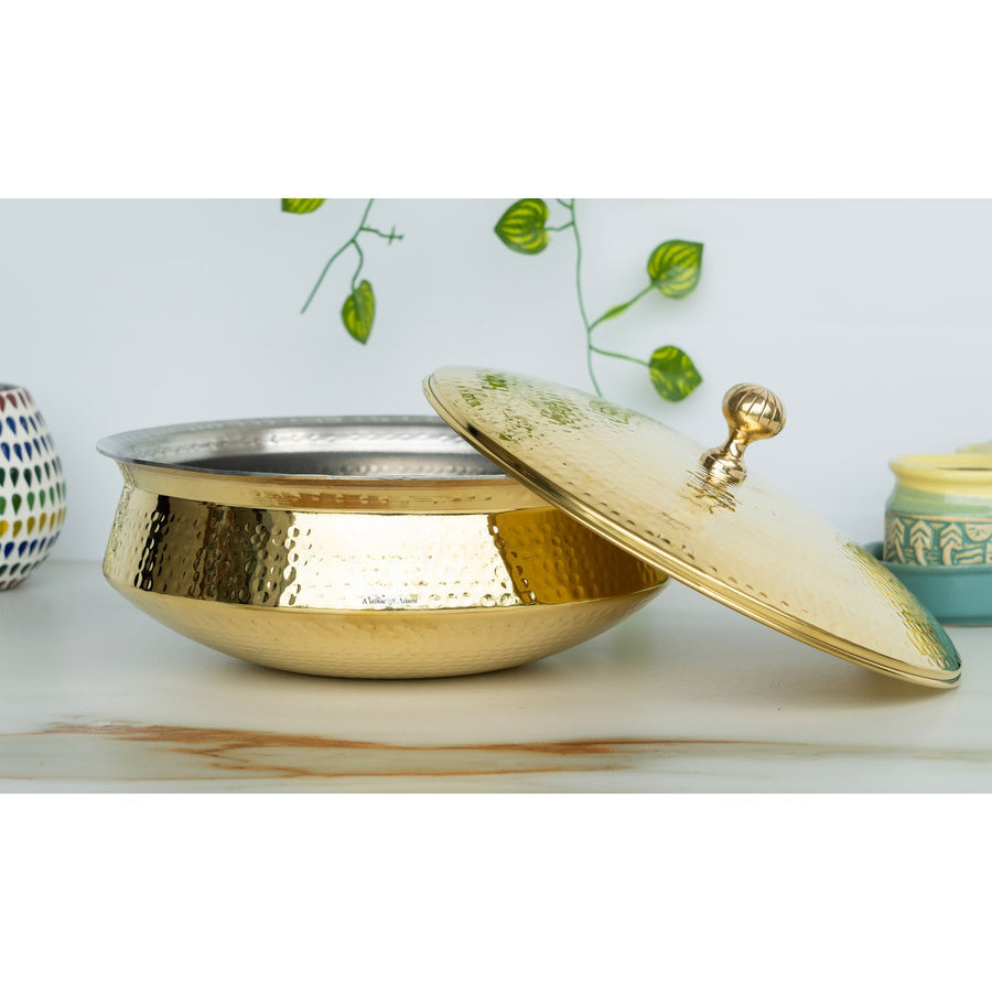 Experience our unique brass zeal cooking utensils for healthy cooking and traditional cooking demonstrations. Made from pure brass, this cookware is naturally non-toxic and non-stick, allowing for safe and easy food preparation. Its heavy-duty construction ensures even heat distribution, making it ideal for slow-cooking dishes like biryani, curry, and dal. Brass is known for its durability, longevity, and flavor enhancement. This brass lagan is a must-have for those who appreciate healthy and authentic cooking, perfect for everyday use and special occasions. Shop now to bring home this traditional, eco-friendly kitchen essential.