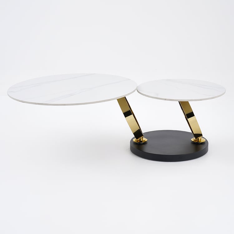Elevate your living room with this stunning swing coffee table featuring two elegantly swinging marble tops and a striking gold-and-black colored base—a perfect blend of form and functionality.