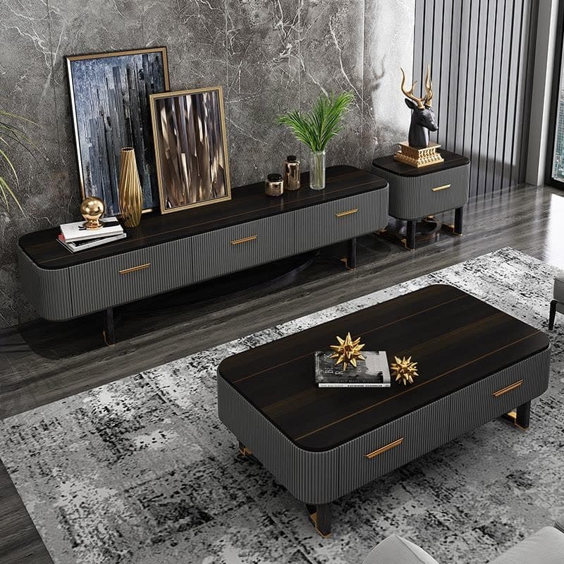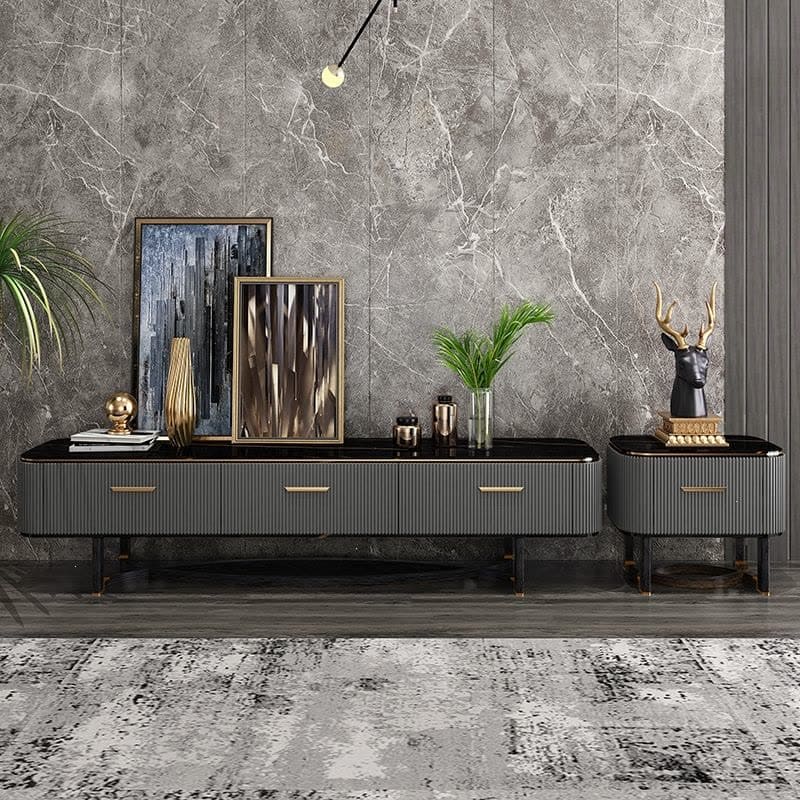 Make a statement in your entertainment area with this classy TV media console befitting the modern Indian home. This set oozes style along with functionality and features a luxurious black marble top along with a slick grey wooden base. Its sturdy metal legs add a touch of contemporariness, ensuring durability and stability. Whether you are organizing your media devices or giving a stylish touch to your living room, this set is the perfect mix of form and function. This bundle provides elegance for any look at interior design and enhances decor.